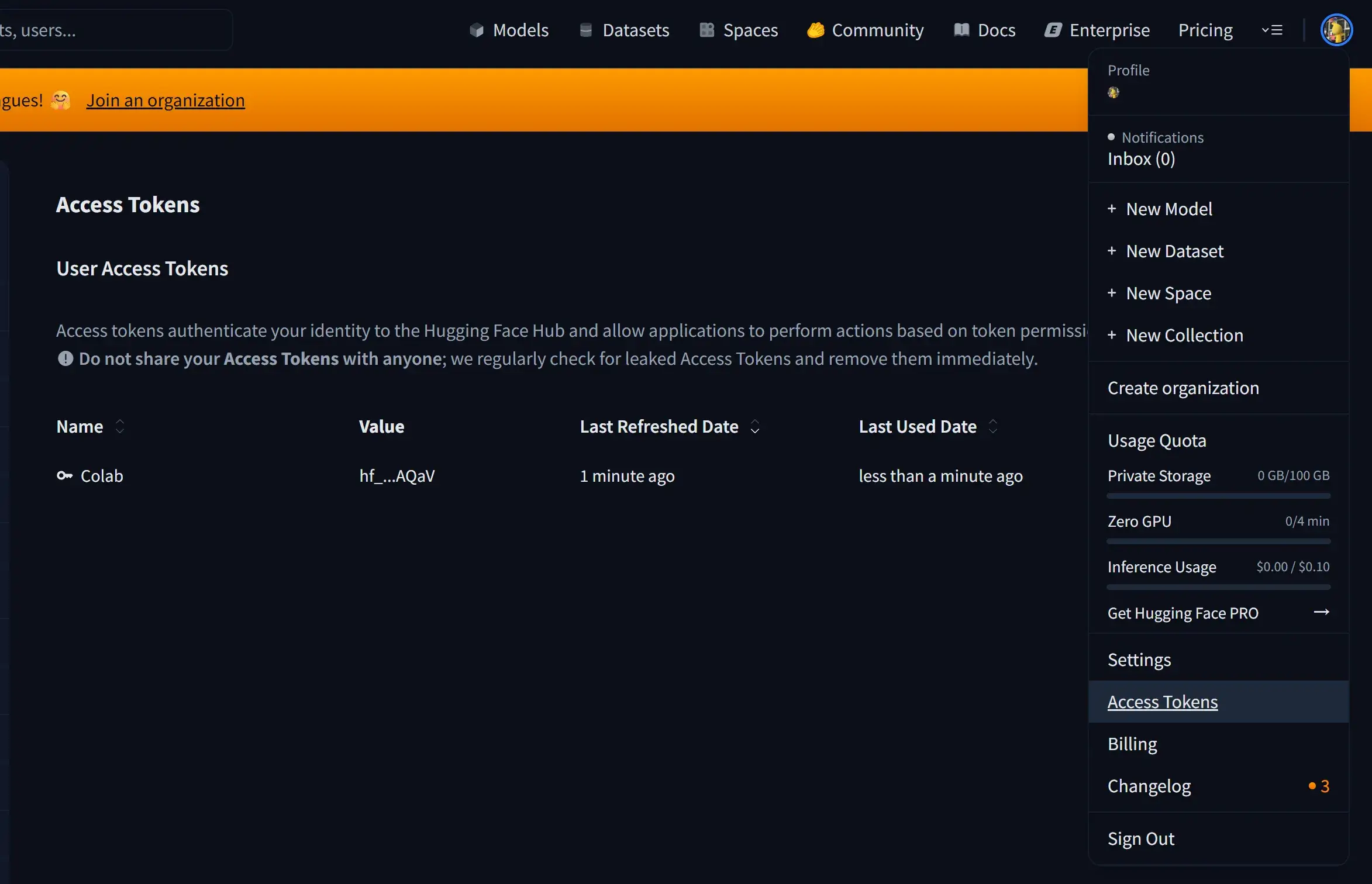 从 Hugging Face 中的 Access Tokens 获取 Token 用于登录: