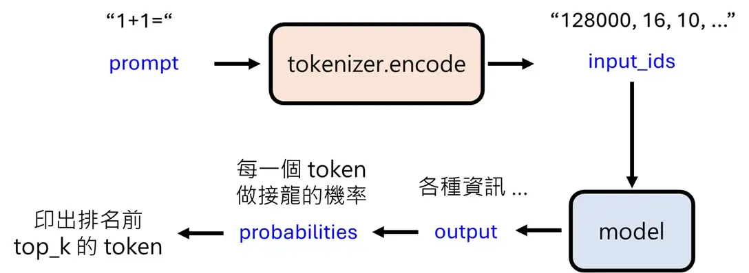 print(f"Token ID: {token_id}, Token: '{token_str}', 機率: {probability:.4f}")輸入的 prompt 是: 1+1=