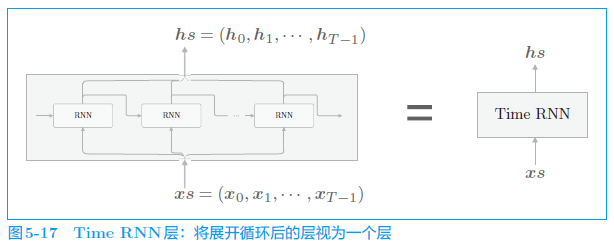Time RNN 层是 T 个 RNN 层连接起来的网络。我们将这个网络实现为 Time RNN 层。这里,RNN 层的隐藏状态 h 保存在成员变量中。