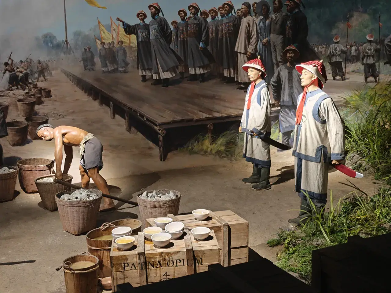 “恶焰薰天带血腥,流传海内成鸩毒”。自唐至明六百余年,鸦片一直作为药物而存在,但是随着吸食风气的流行,鸦片成为危害甚巨的毒品。 自十八世纪中后期以来,以英国为首的西方资本主义国家加紧推行贸易扩张政策,竟将鸦片作为打开中国市场大门的敲门砖,武装走私,大肆倾销,致使中国陷入一片黑潮毒雾之中;严重腐蚀了社会肌体,成为清主朝身上的巨大毒瘤,危及中华民族的生死存亡。 1839 年,以林则徐为代表的中国人民掀起人类历史上第一次大规模禁毒浪潮,二百三十多万斤的英美鸦片在虎门海滩当众公开销毁,震惊世界,揭开了中国近代反侵略斗争的序幕,在世界禁毒史上写下了光辉的篇章。