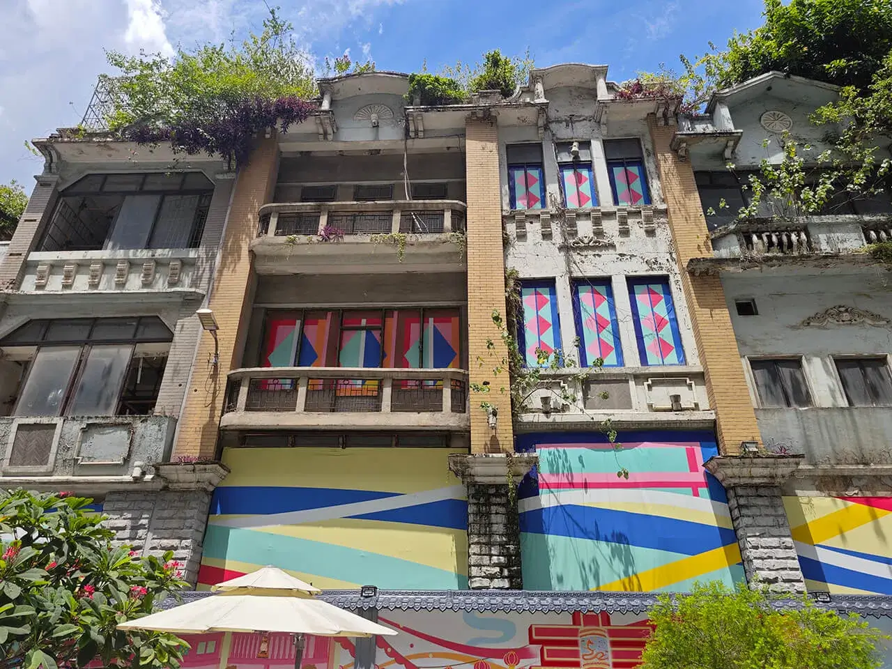 灰溜溜的建筑上充满了花花绿绿的装饰。
