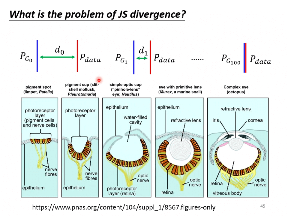 由于 JS 散度对于两个毫不重叠的分布返回值永远是 ,无法衡量两个不重叠的分布的距离,导致 D 的识别率几乎为 ,并且找不到优化的方向。