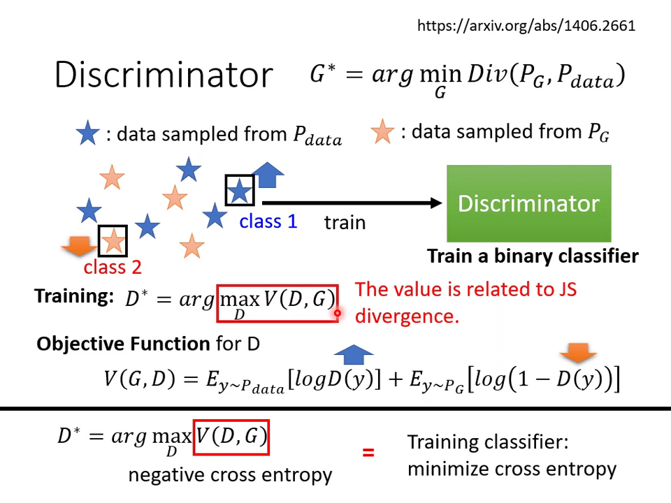 - Step 2: Fix discriminator D, and update generator G, 尝试查找 ,这个值与 JS 散度有关(对最早的 GAN 而言)。