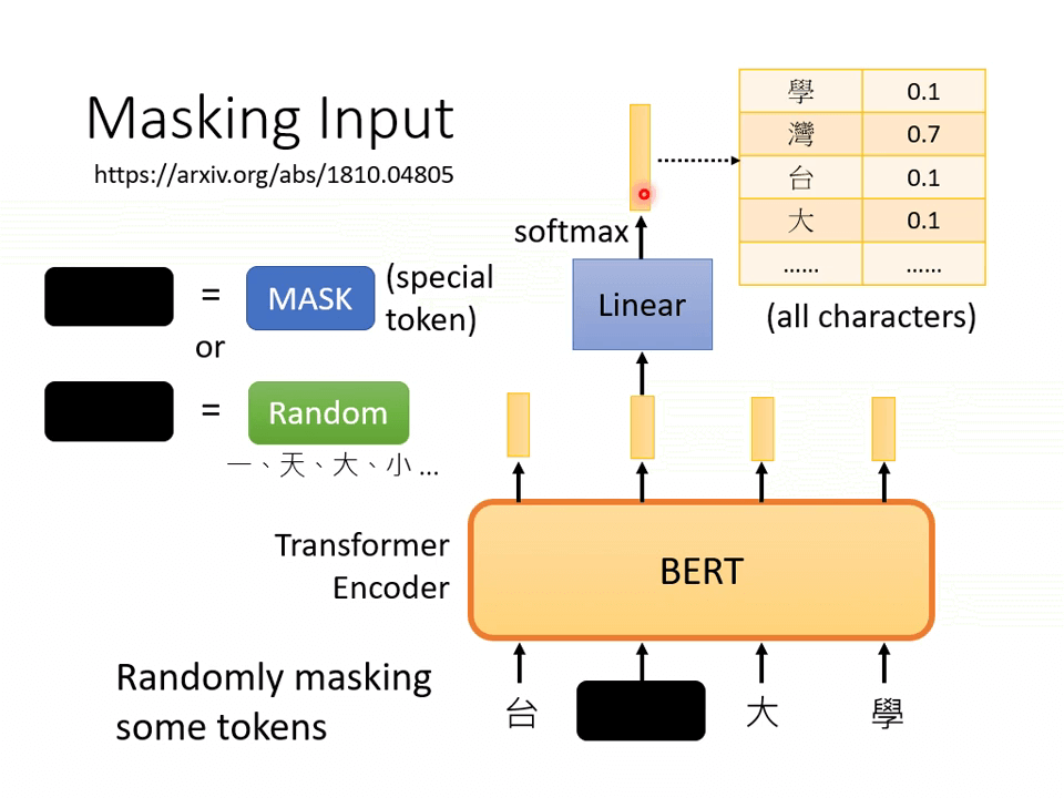 被遮盖的单位输出的向量经过 linear(乘上一个矩阵),再经过 softmax 输出一个向量,去和所有的字体做对比,找出被遮盖的字最可能是什么字。对比的过程就是计算最小的 cross entropy,就像做分类问题一样,经过 softmax 的输出向量和所有字体代表的单向量做计算。
