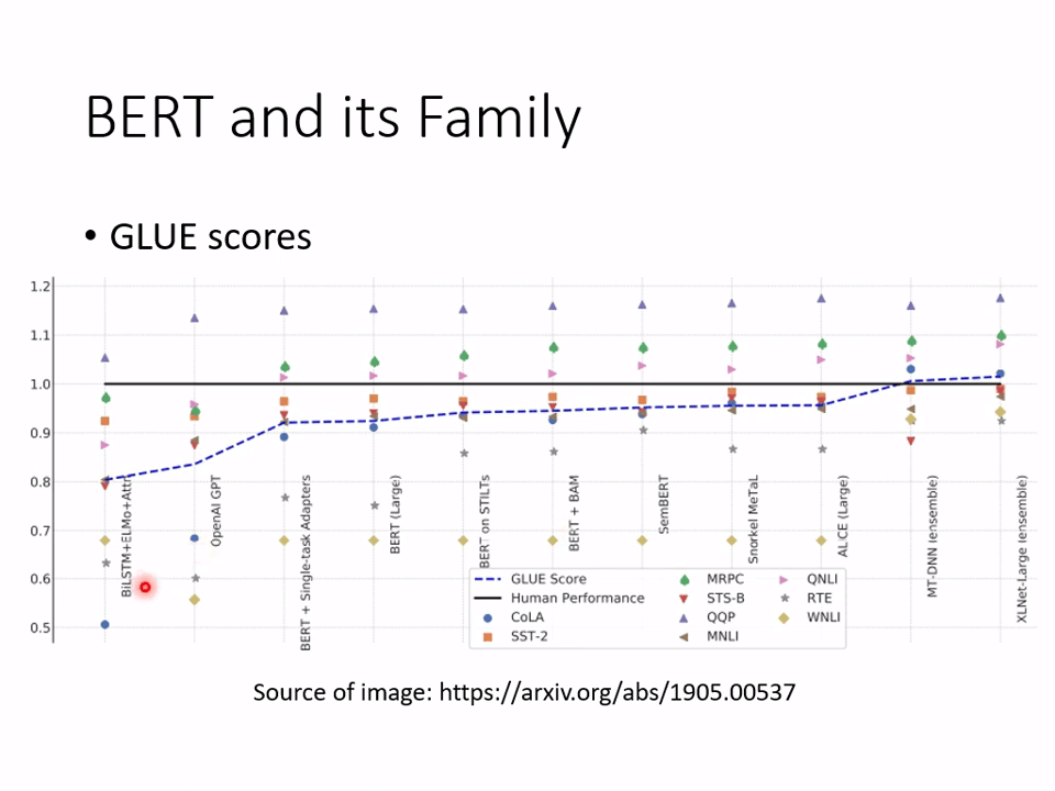 论文[1905.00537] SuperGLUE: A Stickier Benchmark for General-Purpose Language Understanding Systems (arxiv.org)展示了不同种模型 GLUE 得分。