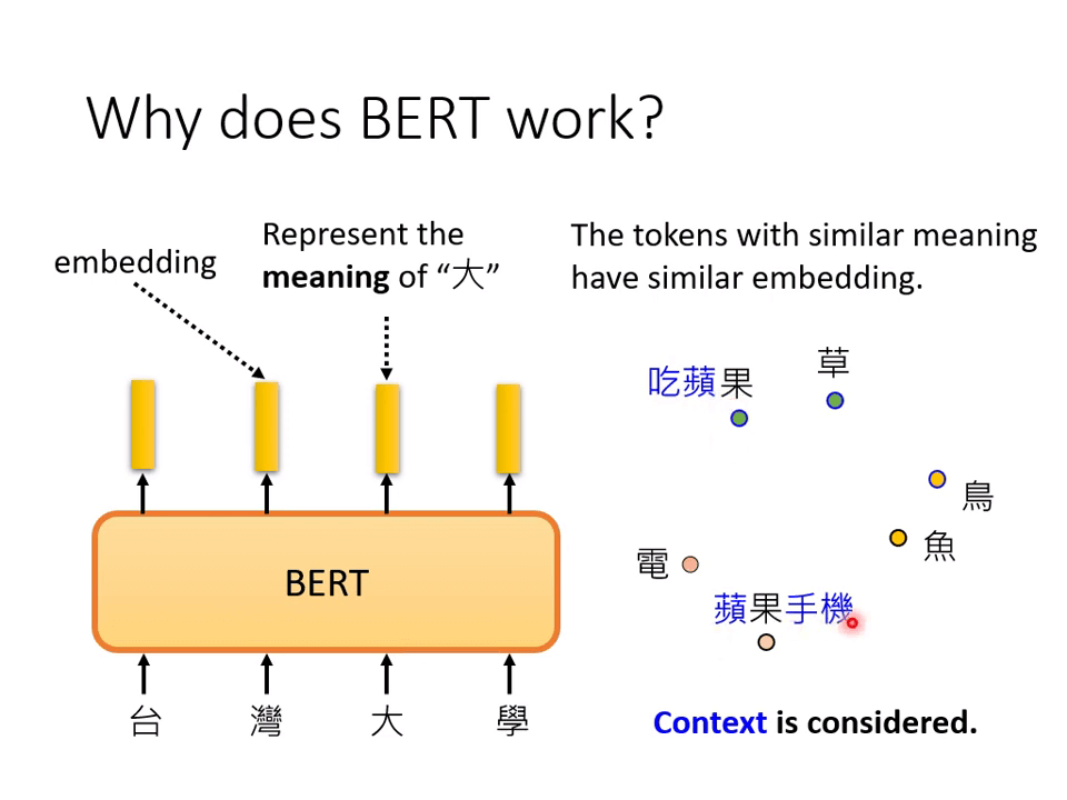 训练填空题 BERT 时,从上下文抽取资讯来填空,两个果的语义输出的向量不同了。