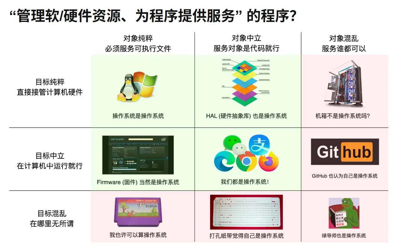 - 硬件(计算机、计组、数电、模电)、软件(程序,本课程视角、数据结构与算法、网络……)、操作系统(管理硬件和软件的软件)