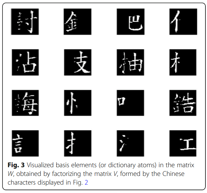 汉字的每个二进制图像都用一个 的矩阵表示。为了建立要因子分解的矩阵(),将字符的每个 矩阵转换为大小为 的列。结果,矩阵()由 列组成,每列大小为 ,其中每列表示汉字的训练样本,用 表示,n=10000,m=30。通过应用所提出的 NMF 算法将 分解为大小为 的 和大小为 的 两个矩阵,并设置 r=16,我们可以获得这两个矩阵。其中, 表示基(或字典),H_{r×m} 包含用于构成汉字的相应权重(系数)。