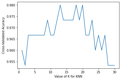 1 2 3 4 5 6 7 8 9 10 11 12 13 14 from sklearn.model_selection import cross_val_scoreimport matplotlib.pyplot as plt k_range = range (1 , 31 ) k_scores = []for k in k_range: knn = KNeighborsClassifier(n_neighbors=k) scores = cross_val_score(knn, X, y, cv=10 , scoring="accuracy" ) k_scores.append(scores.mean()) plt.figure() plt.plot(k_range, k_scores) plt.xlabel("Value of K for KNN" ) plt.ylabel('Cross-Validated Acuracy' ) plt.show()