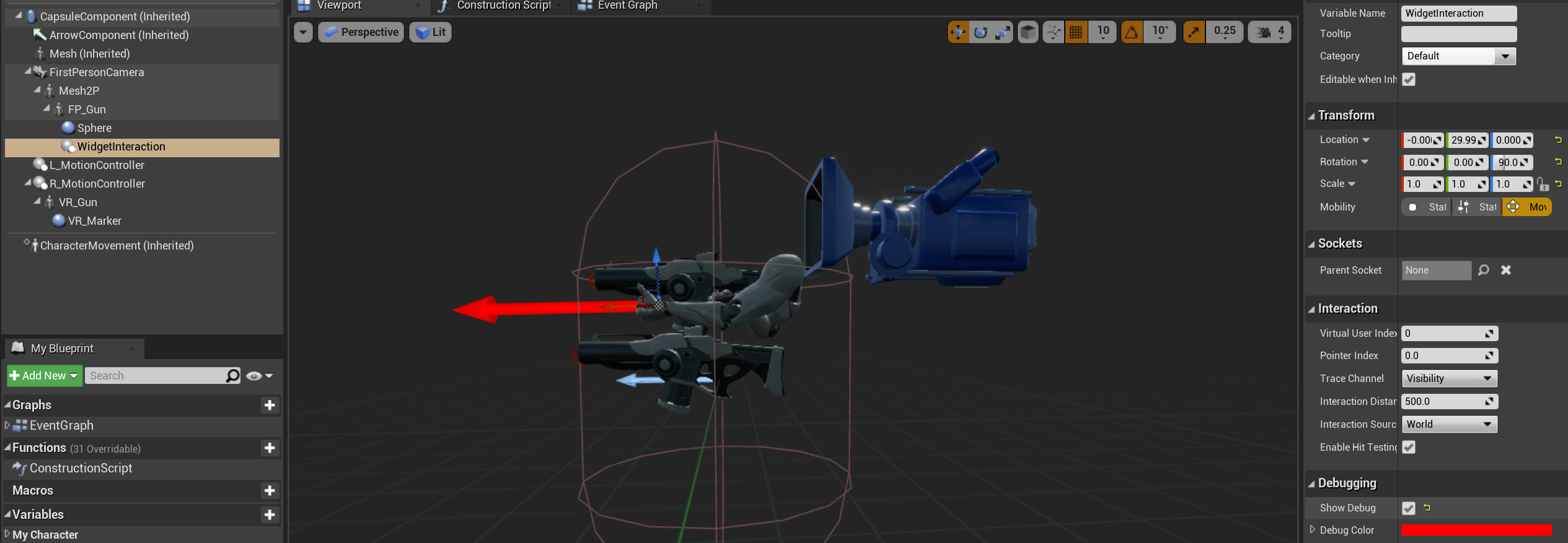 在第一人称人物中,给枪下面安装节点 WidgetInteraction,调整 Transform,可以打开 Show Debug 以便于调试。