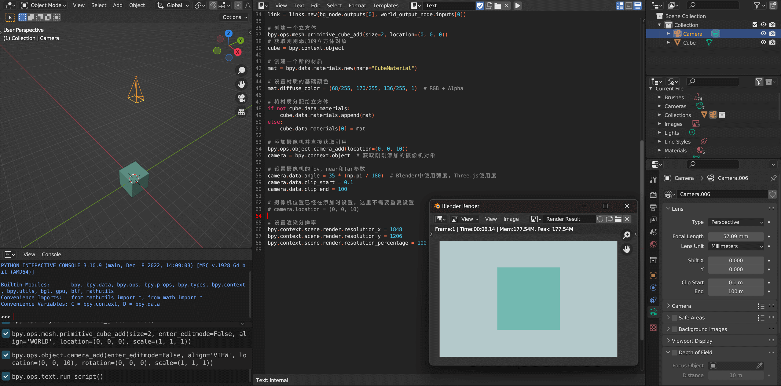 1 2 3 4 5 6 7 8 9 10 11 12 13 14 15 16 17 18 19 20 21 22 23 24 25 26 27 28 29 30 31 32 33 34 35 36 37 38 39 40 41 42 43 44 45 46 47 48 49 50 51 52 53 54 55 56 57 58 import bpyimport numpy as np bpy.ops.object .select_all(action='SELECT' ) bpy.ops.object .delete(use_global=False ) bpy.context.scene.render.engine = 'CYCLES' world = bpy.data.worlds['World' ] world.use_nodes = True nodes = world.node_tree.nodes nodes.clear() bg_node = nodes.new(type ='ShaderNodeBackground' ) bg_node.inputs[0 ].default_value = (135 /255 , 206 /235 , 235 /255 , 1 ) world_output_node = nodes.new(type ='ShaderNodeOutputWorld' ) links = world.node_tree.links link = links.new(bg_node.outputs[0 ], world_output_node.inputs[0 ]) bpy.ops.mesh.primitive_cube_add(size=2 , location=(0 , 0 , 0 )) cube = bpy.context.object mat = bpy.data.materials.new(name="CubeMaterial" ) mat.diffuse_color = (68 /255 , 170 /255 , 136 /255 , 1 ) if not cube.data.materials: cube.data.materials.append(mat)else : cube.data.materials[0 ] = mat bpy.ops.object .camera_add(location=(0 , 0 , 10 )) camera = bpy.context.object camera.data.angle = 35 * (np.pi / 180 ) camera.data.clip_start = 0.1 camera.data.clip_end = 100 bpy.context.scene.render.resolution_x = 1848 bpy.context.scene.render.resolution_y = 1206 bpy.context.scene.render.resolution_percentage = 100